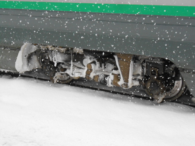 微妙に遅れが出てるようでした。台車にも雪が絡み付いてます。