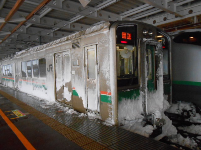 運休で手持ち無沙汰になった奥羽線の701系は電気消して昼寝中。