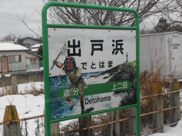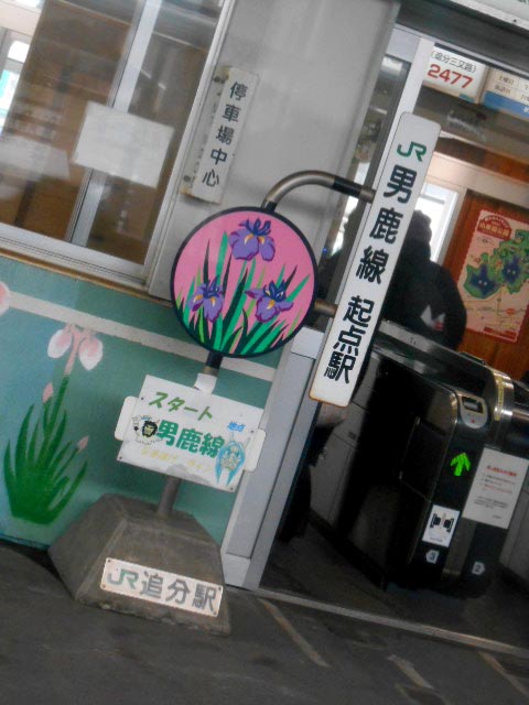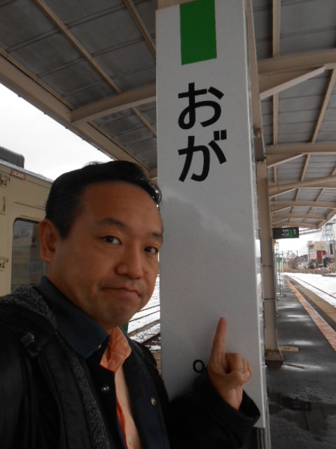 男鹿線に入ると、各駅の駅名板が共通して「このデザイン」です。