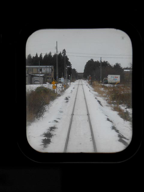 雪の残る線路を真っ直ぐに伸びる線路…。