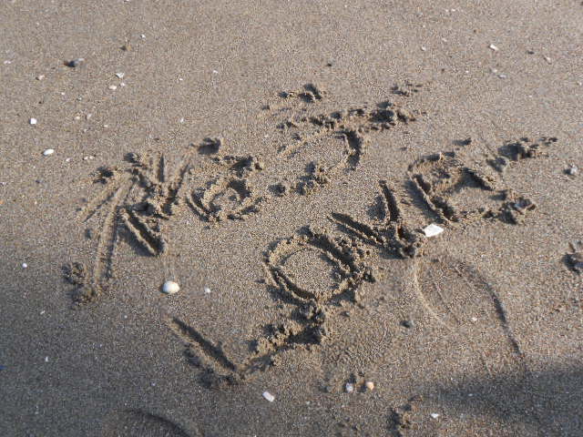砂に棒っ切れで字を書いたり、白いサンダルを手に持って裸足で