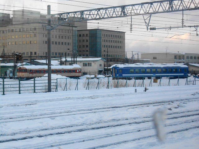 発車してすぐの車両基地には、国鉄塗装のキハ56と「海峡」仕様の