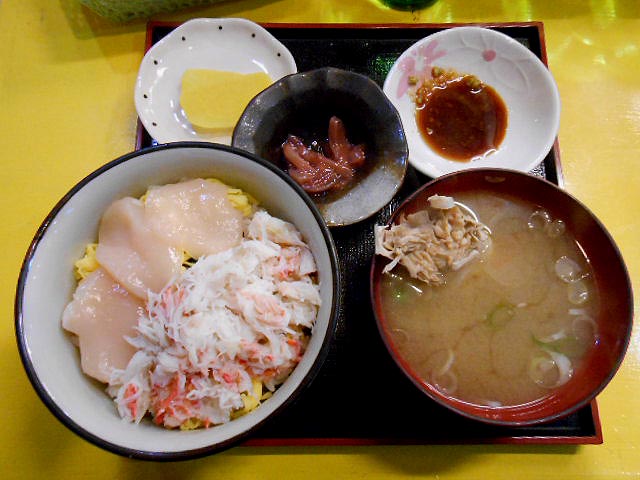 …という事で朝からまた海鮮丼。味噌汁にもカニ身が入ってます。んまー。
