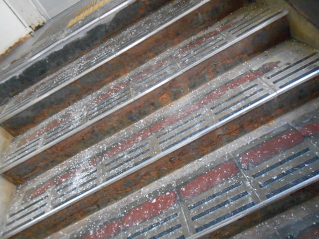 …鉄製の階段に塩分を撒くから、サビによる腐食が激しい感じですが。