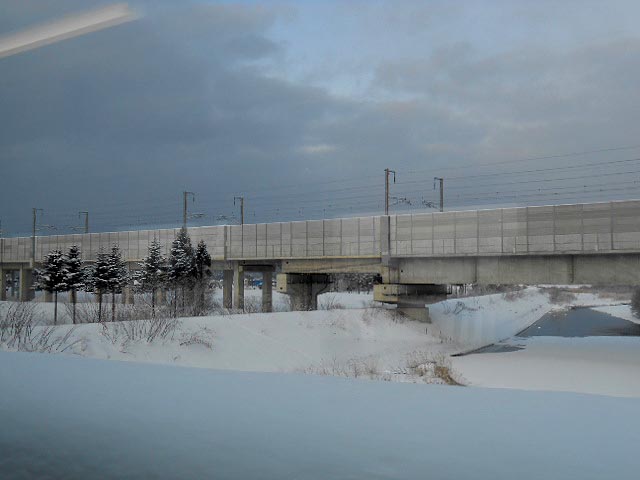 発車した直後に上を通る新幹線の高架。