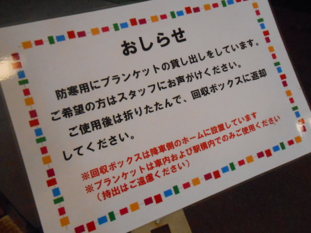 と、まだ寒い方にはブランケット(毛布)を貸して貰えるようです。