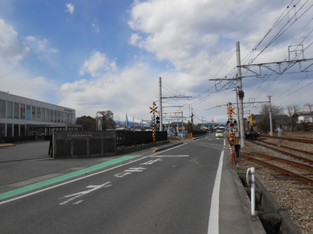 本線から斜めに引込線が反れて、道路を強引に渡った場所にあるのが