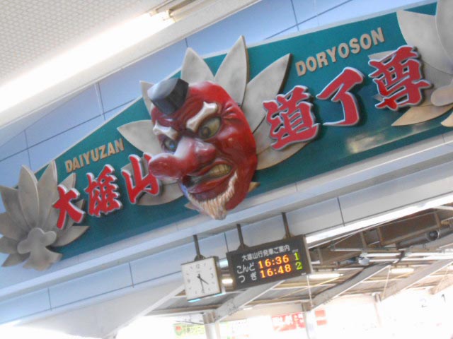 昭和初期と思しき駅の写真に、大雄山に由来する(のか?)巨大天狗…。