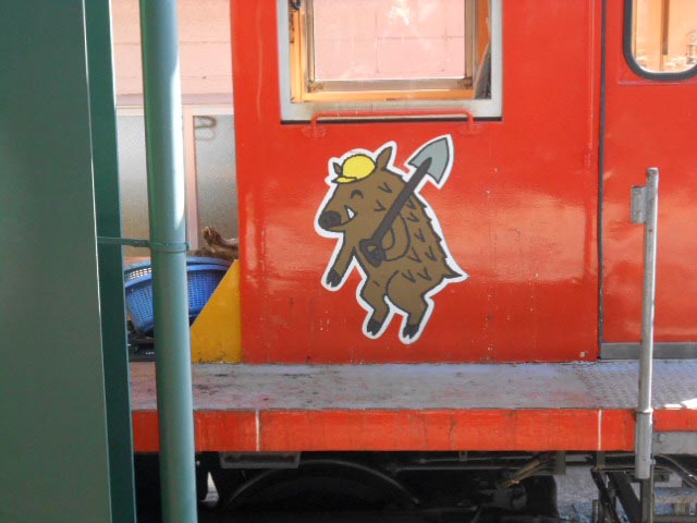 側線に置いてあった工事用と思しき車両に、可愛いイノシシの