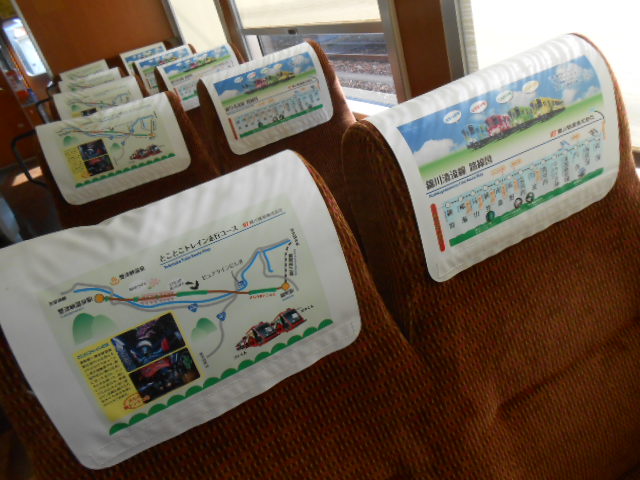 車内は転換クロスシートで、座席カバーの部分に沿線案内がデザイン