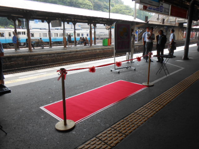 …テープカットってのは列車に対して垂直(車体の前)に設置する