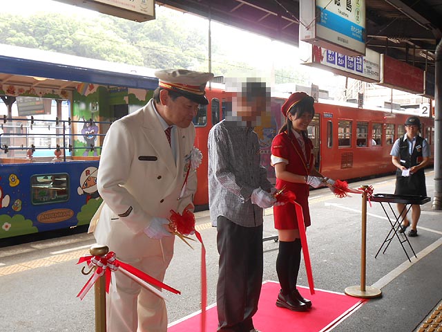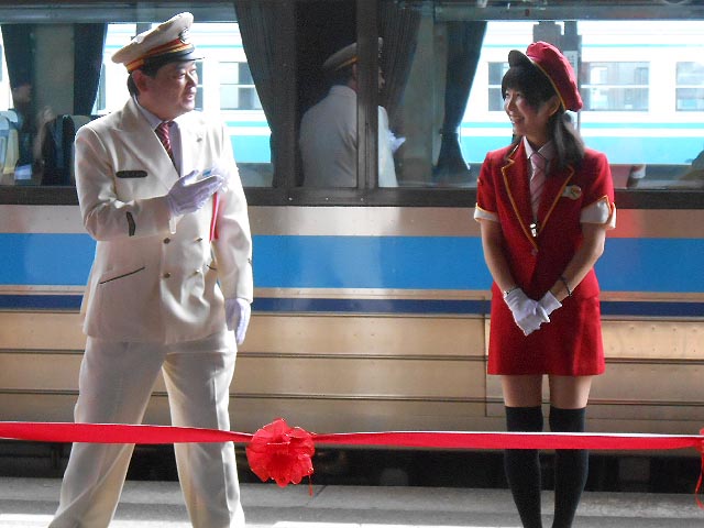 団体行動にありがちな缶バッジを貰い、ホームへ入ると、テープカット