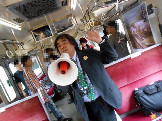 そして、社長が車掌室のマイクを借りて