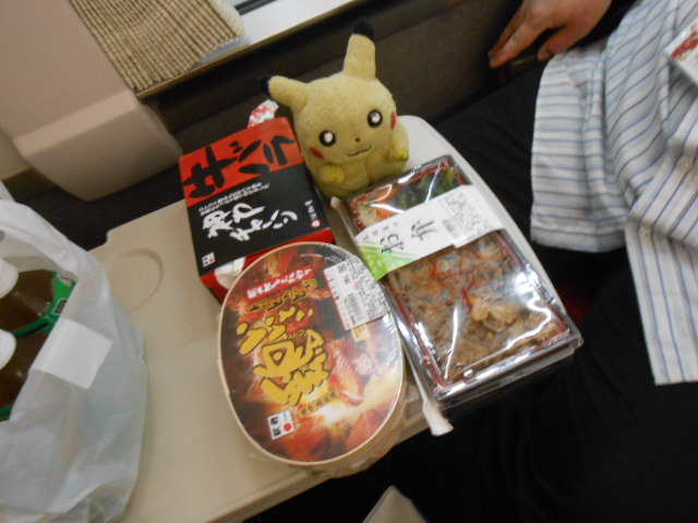 早速に駅弁を広げてます。出発地が神戸なので牛関係が多いね。