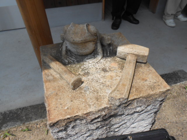ホームにあるカエルと犬釘の謎のモニュメント。トンカチもその一部です。