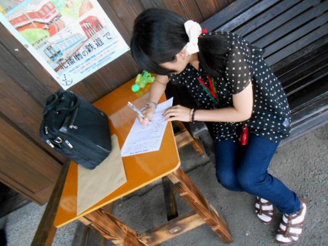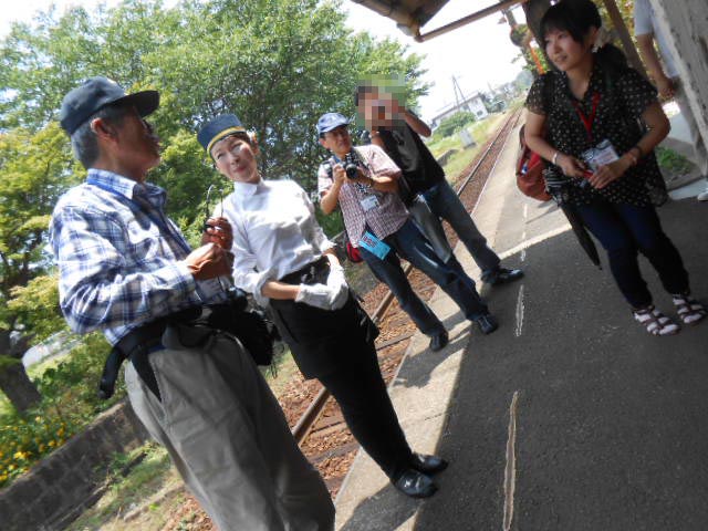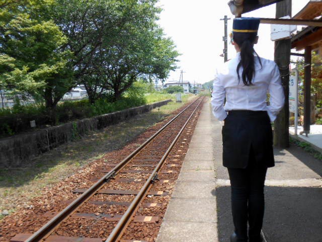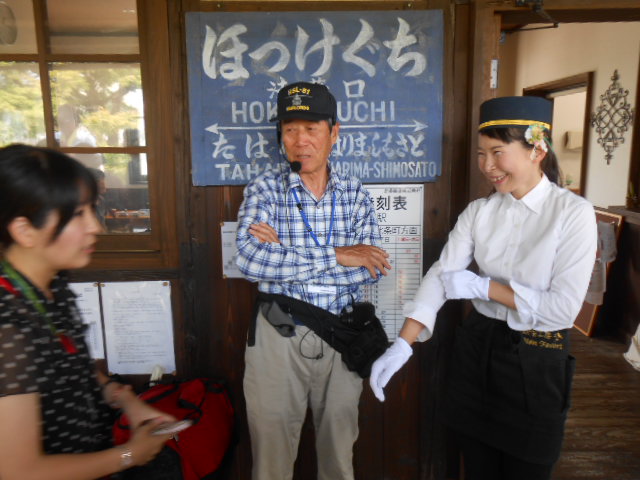 まずはココのボランティア駅長さんが列車を見送るシーンから。