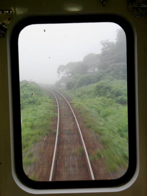 朝靄の中を始発列車が走る。見る角度によっては、18きっぷの