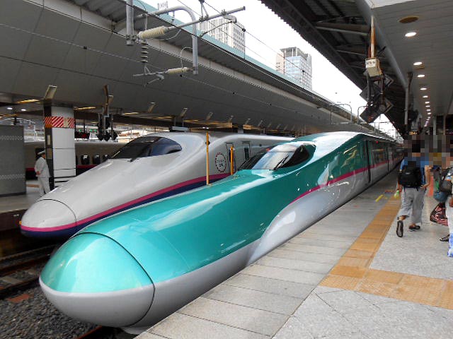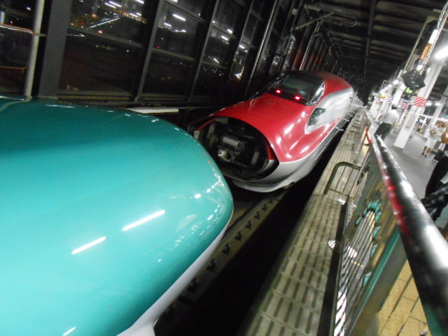 例によってパノラマもどき写真で紹介。今日は左側のE5系に乗ります。