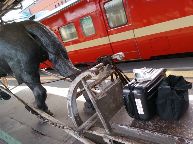 去年、向かいのホームから見た馬の銅像。