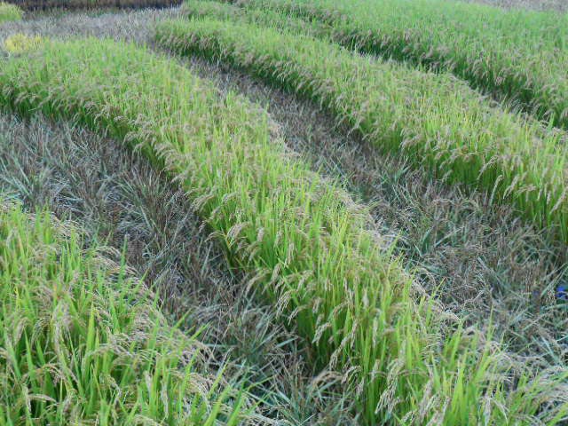 下に降りて見てみると、各種の稲をサンプルのように少しずつ植えて