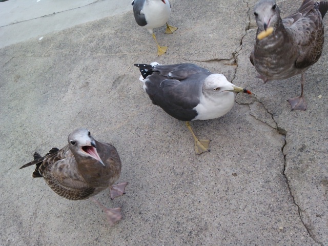 ぁ、前に座ってるご夫婦の奥さんが、ウミネコに殴られました。