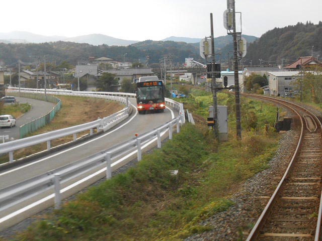 発車してすぐ、柳津方面から来た気仙沼線のBRTと出会いました。