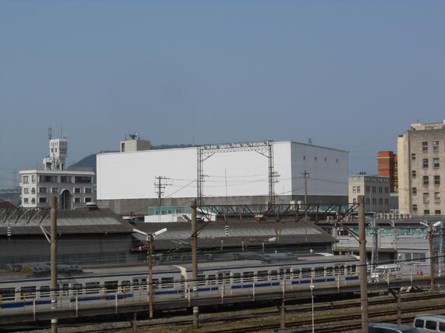 背後に見える大きな白い豆腐のような建造物が、解体修理中の