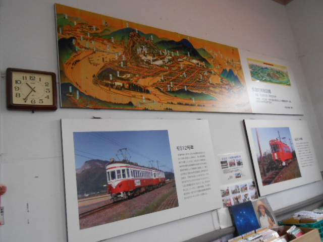 廃止当時のモノと思しき時刻表や、古い絵地図などが展示されてました。