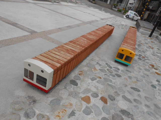 駅前広場にあったベンチが、電車デザインで可愛いの。