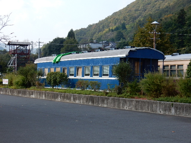 国鉄のブルートレインに似た塗装の、オープンデッキ式の客車は