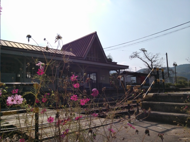 コスモスの咲き乱れる秋の午後、列車の来ない駅でノンビリするのも