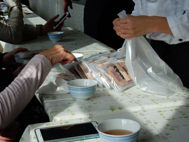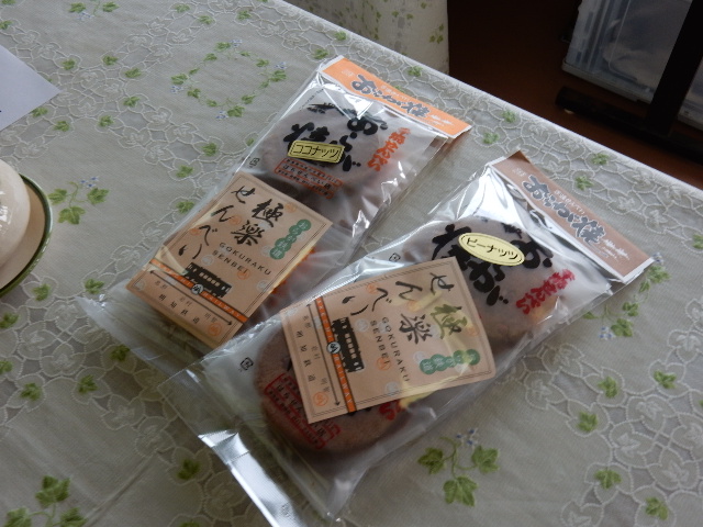 食事も一段落して、お茶タイム。車内オリジナルという極楽せんべいの
