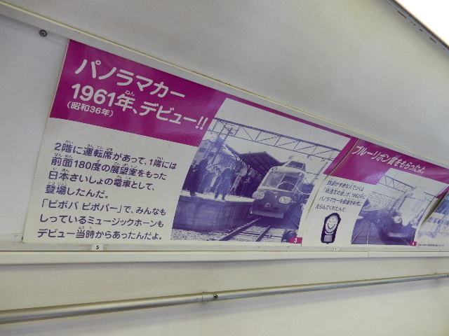 網棚上の広告スペースには、パノラマカーの歴史が写真入りで紹介