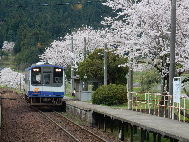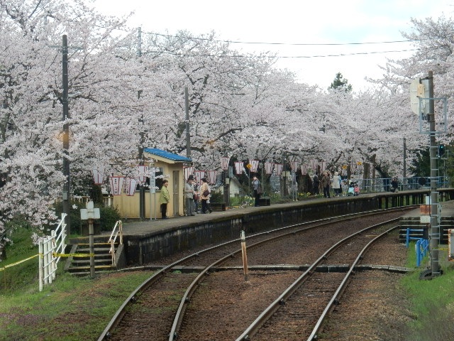 再びの西岸駅では対向列車と交換。こっち側のホームも桜が見事です。