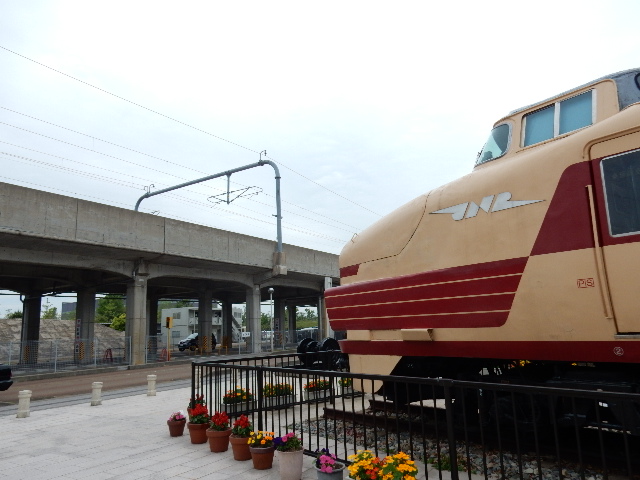 広々とした近代的な公園に、ボンネット型の特急電車がどーん!