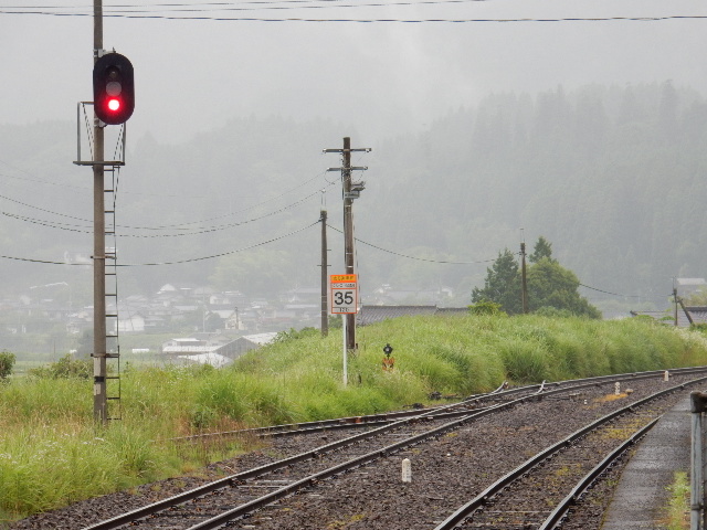 駅舎側の1番線ホームから豊後森方向を見ると、信号機の向こう側、