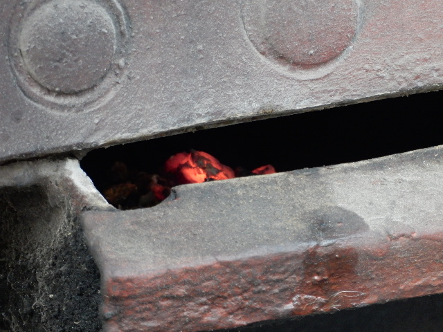 そして火室付近の側面から、赤くなった石炭が見えました。