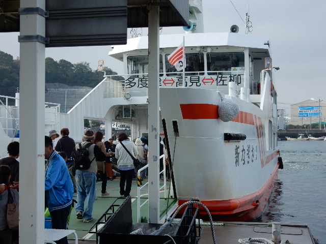 出航時間ギリギリでしたが何とか乗船。…途中に寄る高見島で芸術祭
