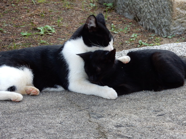 そしてお母さんっぽい感じの白黒ちゃんが登場。猫相互ヨシヨシ。