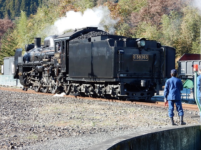 向きを変えたC58363は、再び元来た方向へ戻り、客車の横の線路を通過