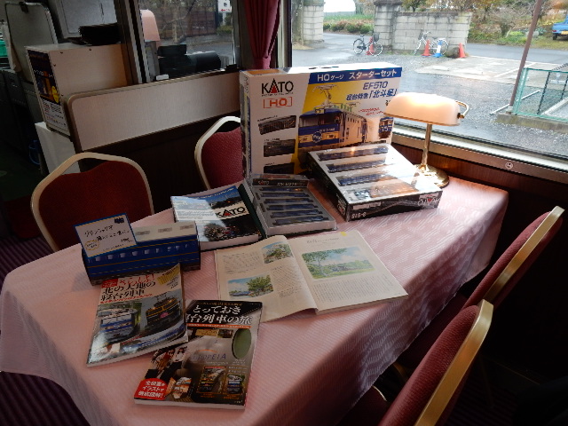 車内の一角にある資料コーナー。模型は非売品です。…まぁ朝イチから