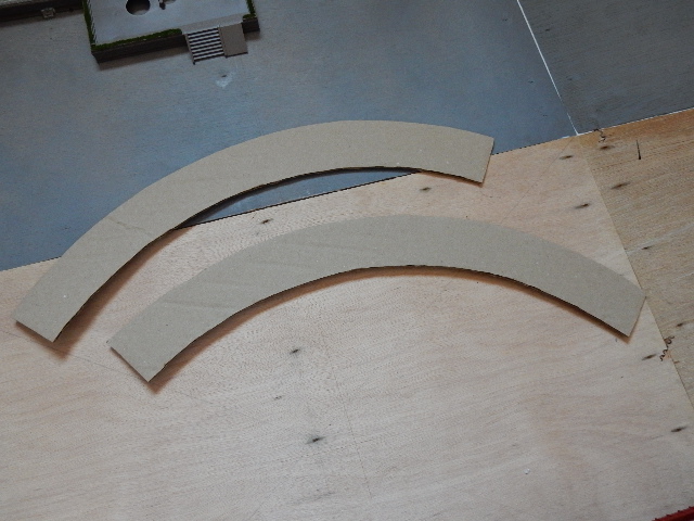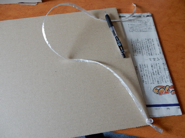 即製のコンパスで段ボールに円弧を描いて切り出します。