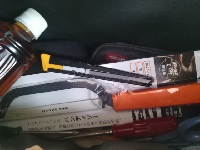 カッターナイフなどの工具を鞄に入れて
