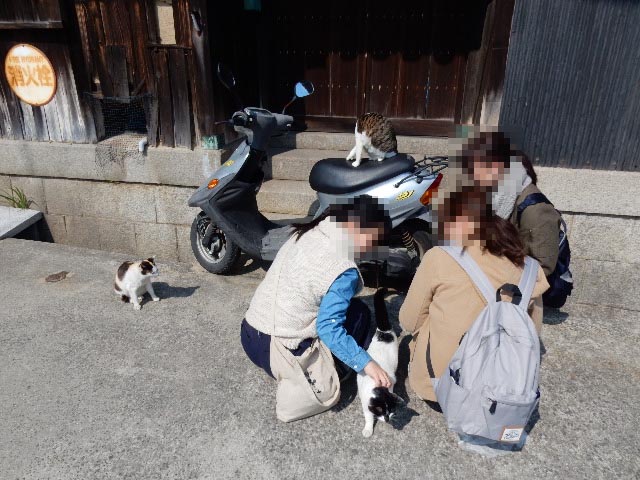 集会場に戻ると、同じ船で来たお姉さんグループが猫ヨシヨシしてました。