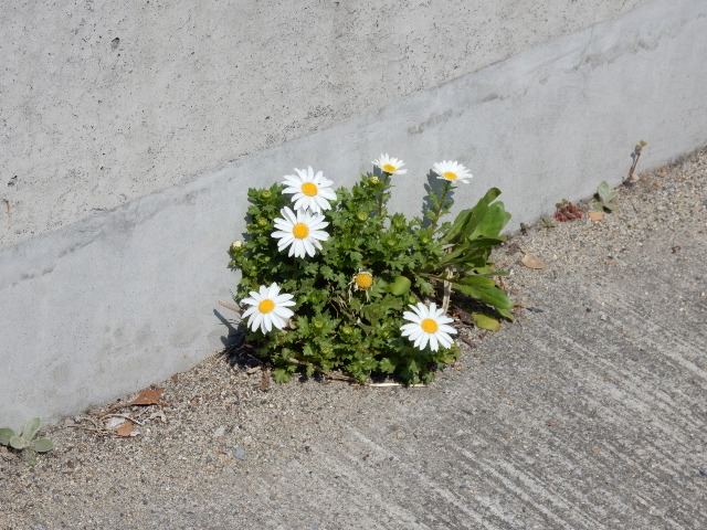 温暖な土地なので、堤防の隙間から早くもヒナギク?が咲いております。