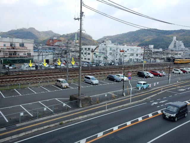 左が、保存車がある公園の真上の道路から見た笠岡駅です。…ココ