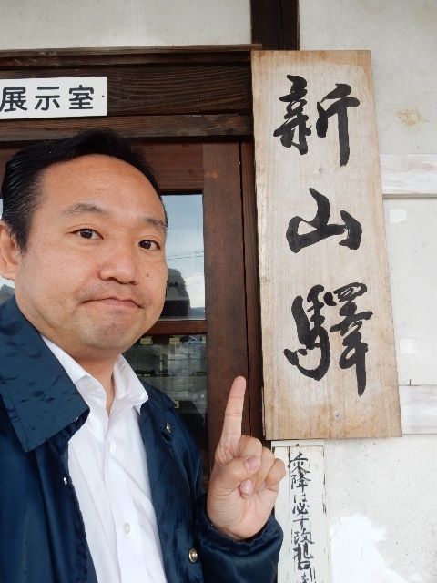 新山駅の跡地へとやってきました。…にわか雨が降り出してますが。