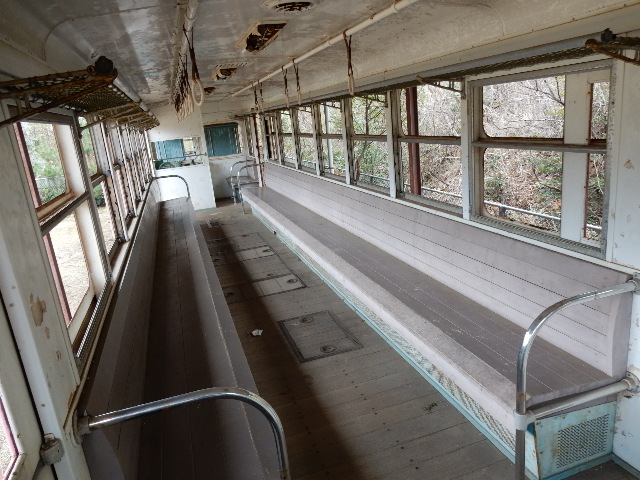 車内はまた、モケットが外されて木製のベンチになってました。