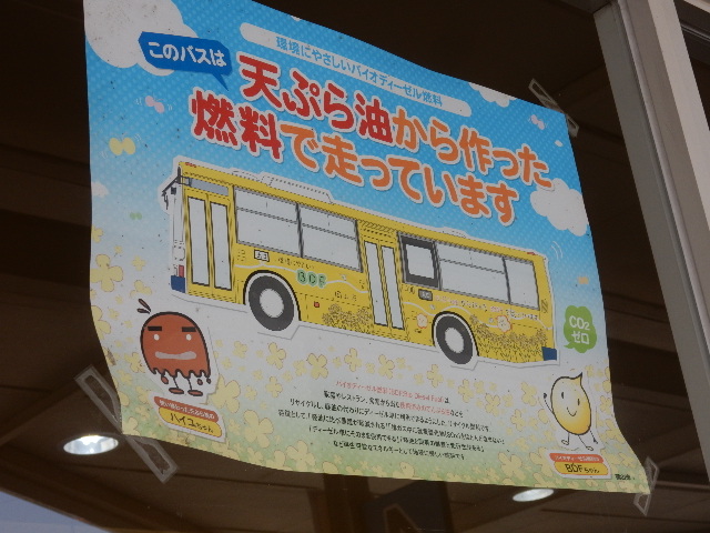 天ぷら油(のリサイクル燃料)で走るバスとか、屋根にソーラーパネルを