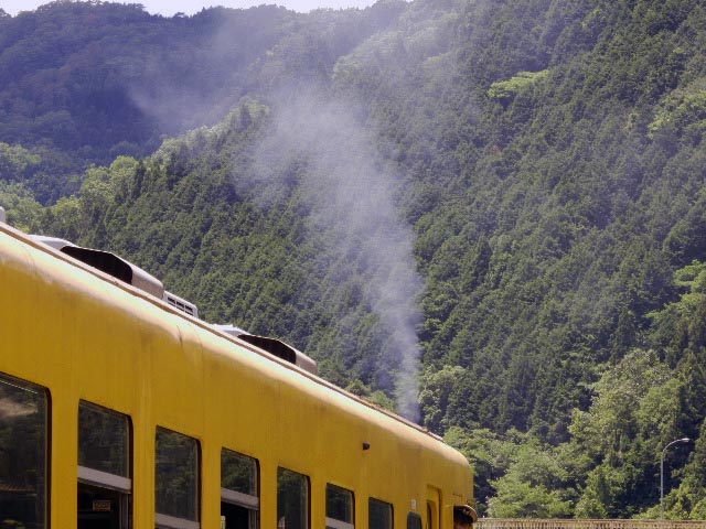 山肌をバックに上がる排気ガスの煙が、蒸気機関車をリアルで知らない